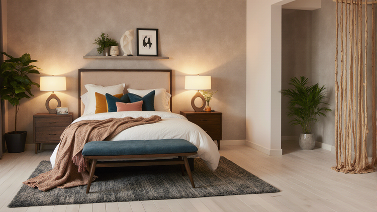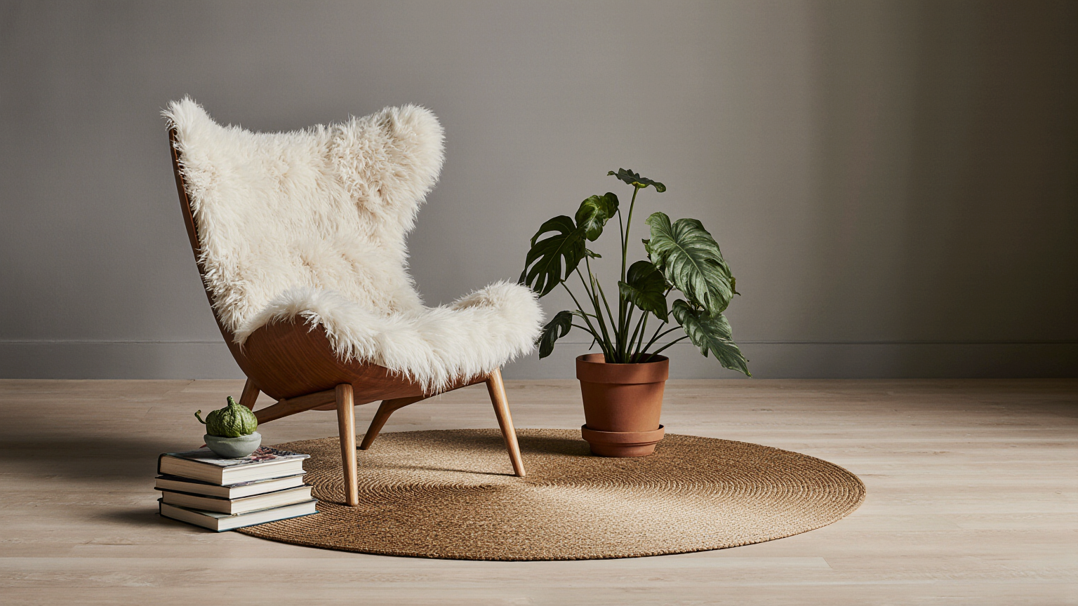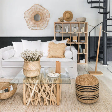 A bright and inviting living room decorated with natural materials and earthy tones. The cozy white sofa, woven accents, and rustic wooden details create a warm bohemian atmosphere, blending comfort with timeless style.