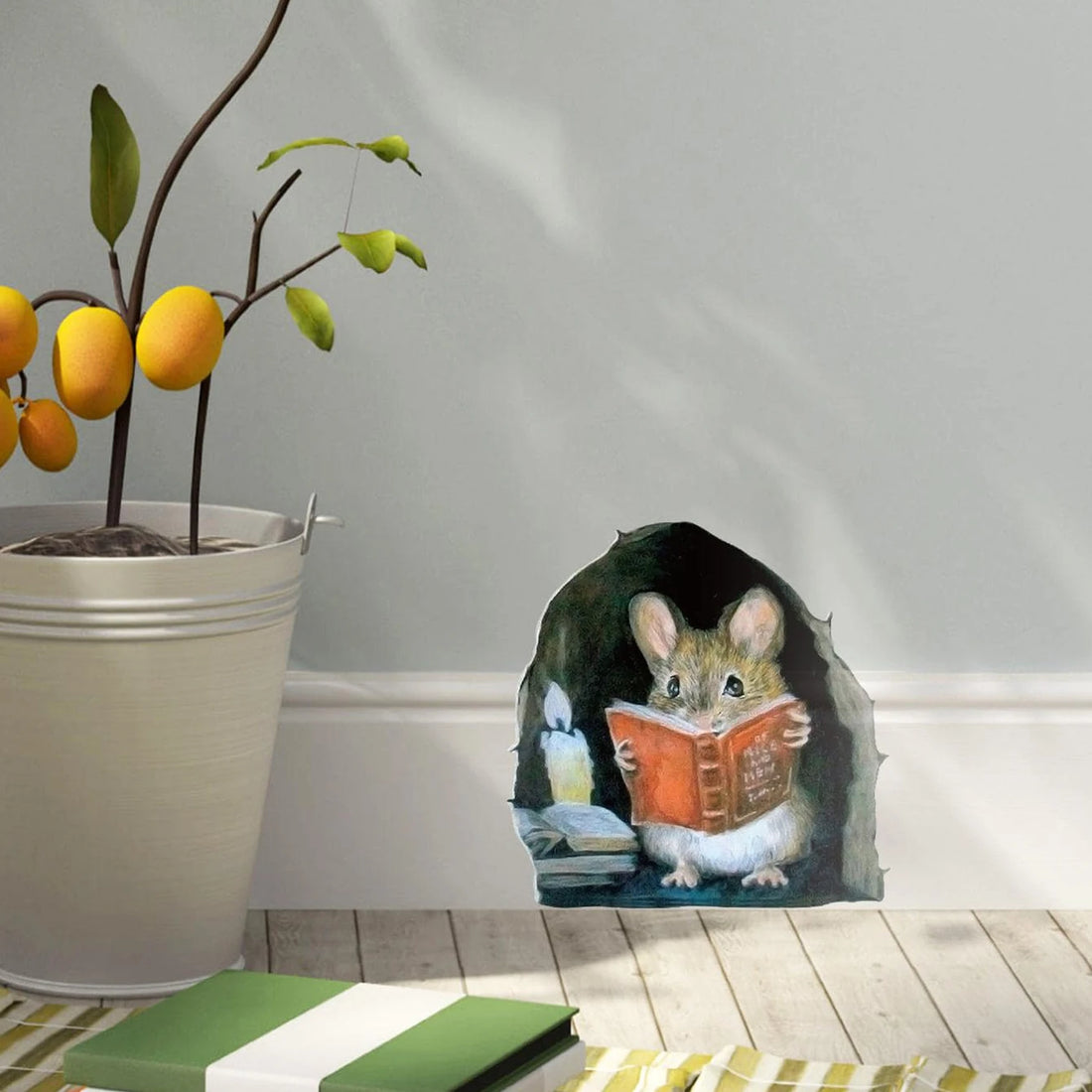 1PC 3D Effect Mouse Hole Sticker Read Flowering Branch Mouse Cute Animal Home Decor Residue Free Adhesive Wallpaper 3.93x3.93in