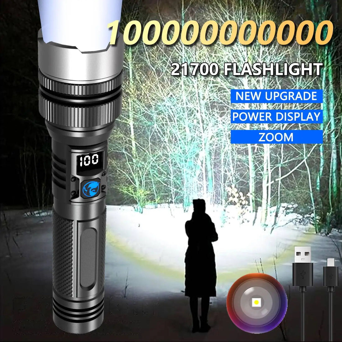 100000000000LM New Upgrade Rechargeable LED Flashlights 3 Lighting Modes Power Bank Telescopic Zoomable Torch 21700 Battery