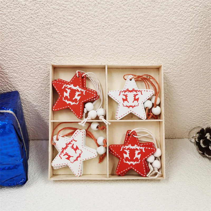 12-Piece Wooden Christmas Decorations Set - Pure Wood Pendants (Deer, Bells, Snowflakes, Stars) | Xmas Tree Ornaments