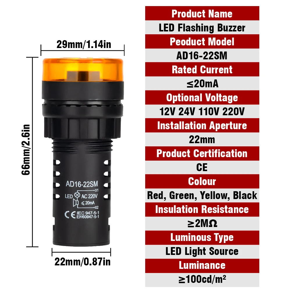 AD16-22SM 22mm Panel Diameter AC DC 12V 24V 110V 220V Flash Signal Light Red LED Active Buzzer Beep Alarm Indicator Green Yellow