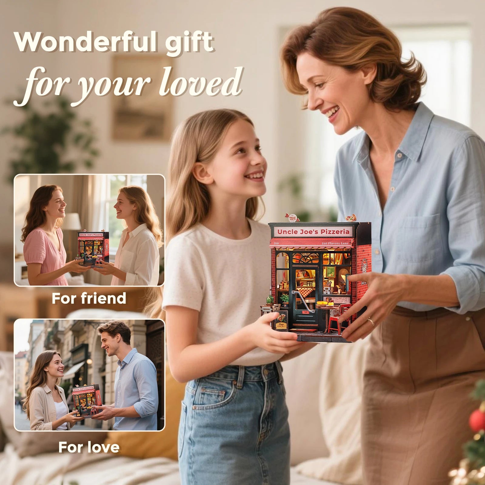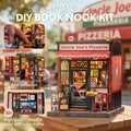 CUTEBEE Book Nook Kit DIY Doll House with LED Light Bookshelf Insert Uncle Joe's Pizzeria Miniature Model For Party Family Gift