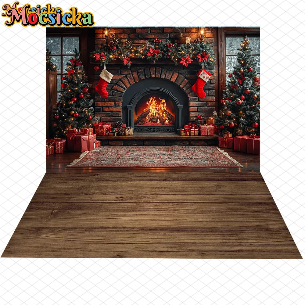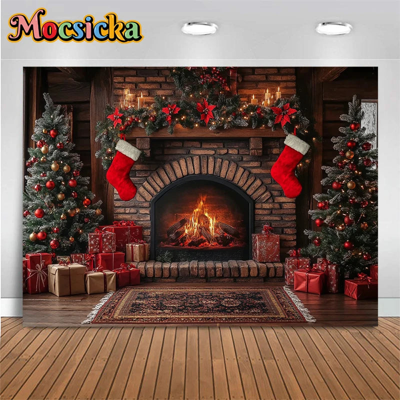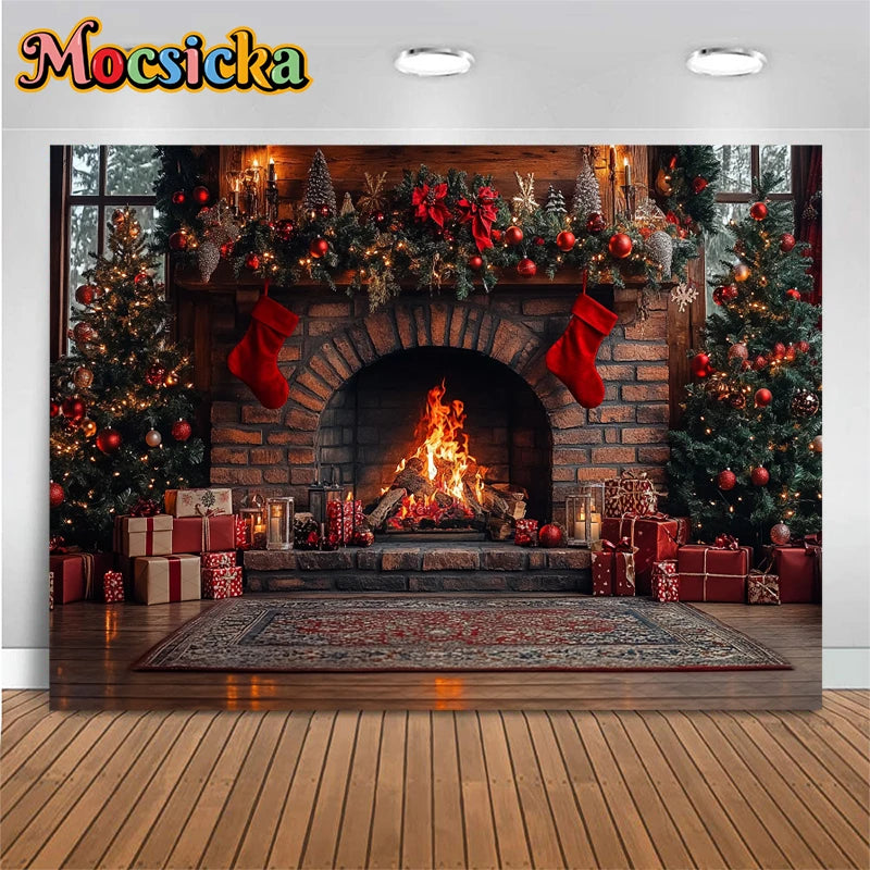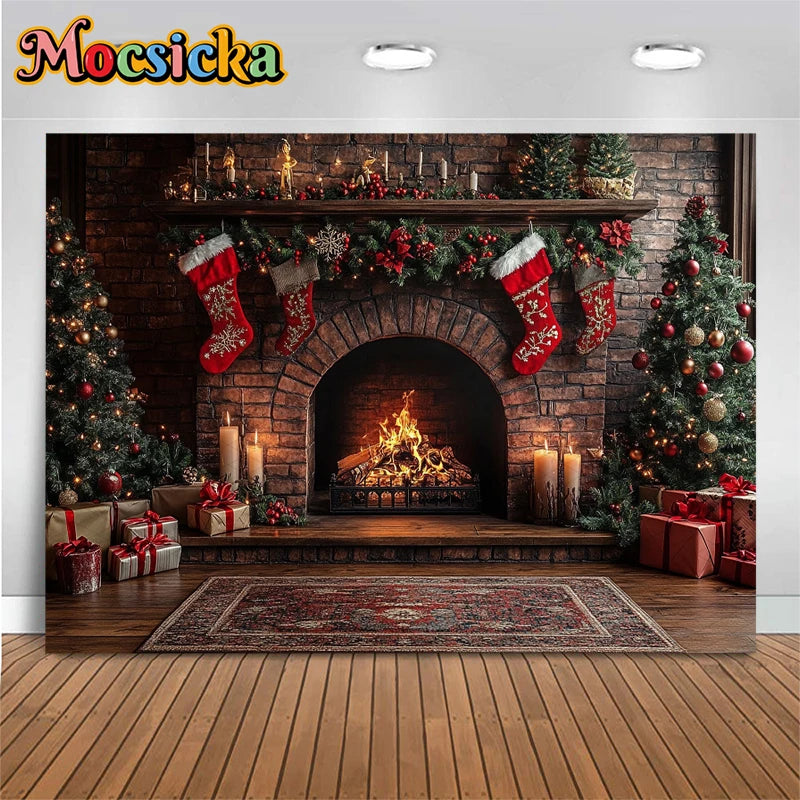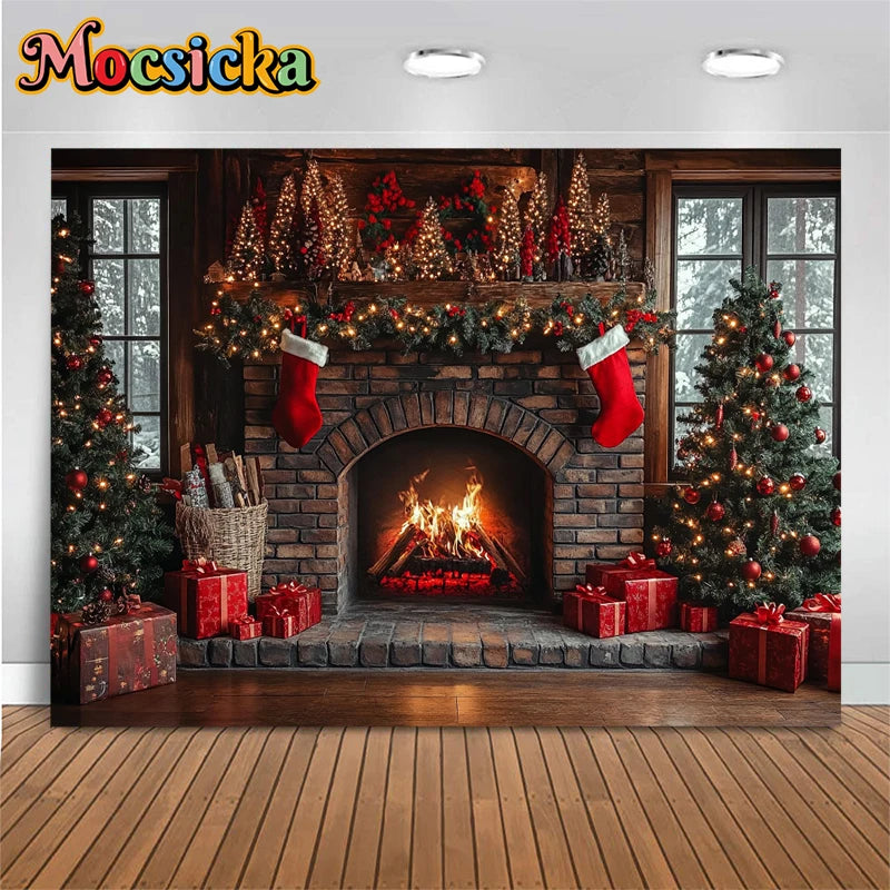 Mocsicka Photography Background Home Christmas Tree Fireplace Decors Child Family Holiday Party Backdrops Shooting Studio Banner