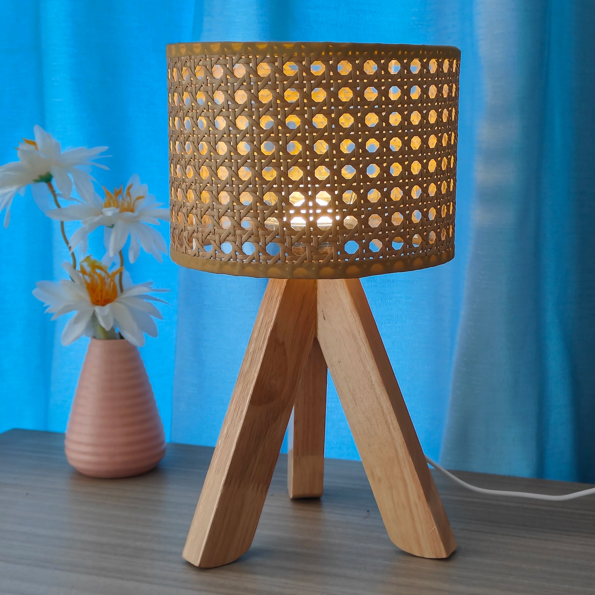 Solid wood tripod, wooden woven home desk lamp with USB power supply, soft light and eye protection